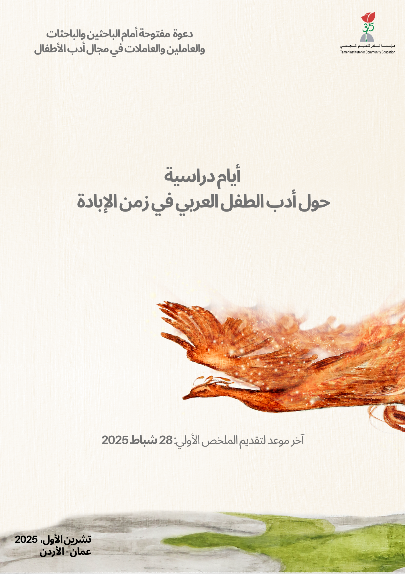 تنظّم مؤسسة تامر للتعليم المجتمعي، بالتعاون مع شركائها، أيّامًا دراسية حول أدب الطفل العربي في زمن الإبادة والحروب والثورات. تفتح هذه الأيّام الدراسية أبواب المشاركة أمام الباحثات/ين والعاملات/ين في مجال أدب الأطفال، بهدف توفير مساحة حرّة للحوار والنقاش وتبادل التجارب والخبرات حول واقع الطفل/ة العربي/ة والإنتاج النقدي والبحثي والأدبي حوله، وإنتاجات الطفل/ة الأدبية والأنشطة المقدمة له/ا في ظل الإبادة والحرب. تسعى هذه الأيام الدراسية إلى صياغة رؤى جديدة حول البعد المادي للوجود العربي والفلسطيني، وتشكيل الوعي المرتبط بالطفل/ة وكينونته/ا كفاعل مفكّر، ودور الخيال في مجابهة سطوة الواقع والتعبير عنه، وتوسيع آفاق النقاش المقارِن والنقدي حول أدب الطفل كحاضنة للحفاظ على الذاكرة والمكان في زمن الإبادة والسعي لبناء أسس لأجيال قادمة تسعى للتحرر من القيود الاستعمارية والاجتماعية والسياسية. تتضمّن الأيام الدراسية عرض لأوراق بحثية، وأوراق مقدمة في جلسات حوارية، إضافة إلى نماذج ورشات للعمل مع الأطفال، مما يتيح فرصة الكتابة الإبداعية والفكرية عن تجارب الأطفال في مختلف سياقات الإبادة والحروب والثورات في العالم العربي وحول العالم. ستعقد الأيام الدراسية في عمّان، الأردن، ما بين 5-7 تشرين الأول 2025.