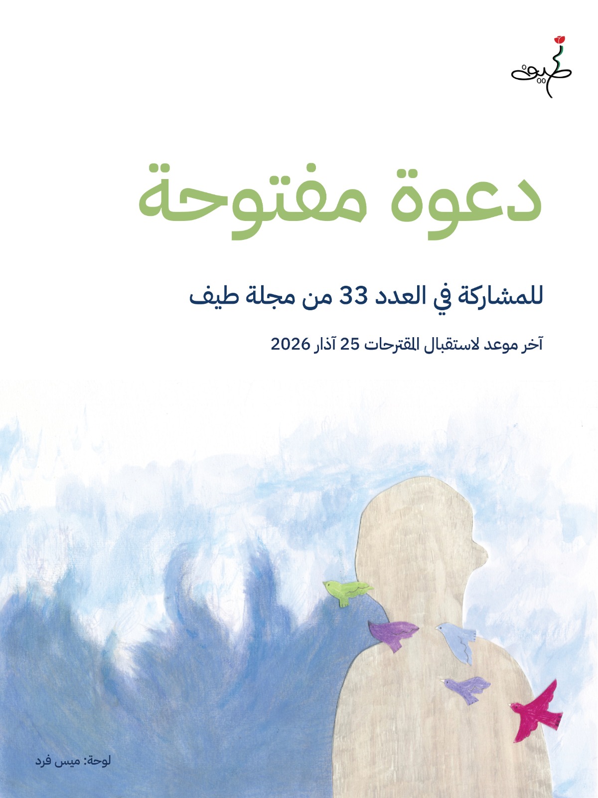 تدعو مجلة طيف جميع الراغبين/الراغبات في المشاركة في عددها الثالث والثلاثين إلى التقدّم من خلال تعبئة النموذج التالي:
